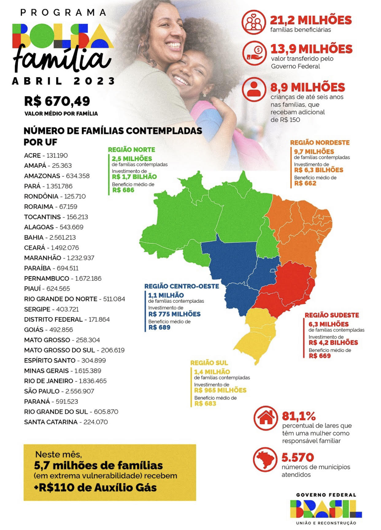 REGIÕES – No recorte por regiões brasileiras, o maior número de beneficiários se concentra nos nove estados do Nordeste, com 9,73 milhões de famílias contempladas, a partir de um investimento de R$ 6,34 bilhões e benefício médio de R$ 662,68.