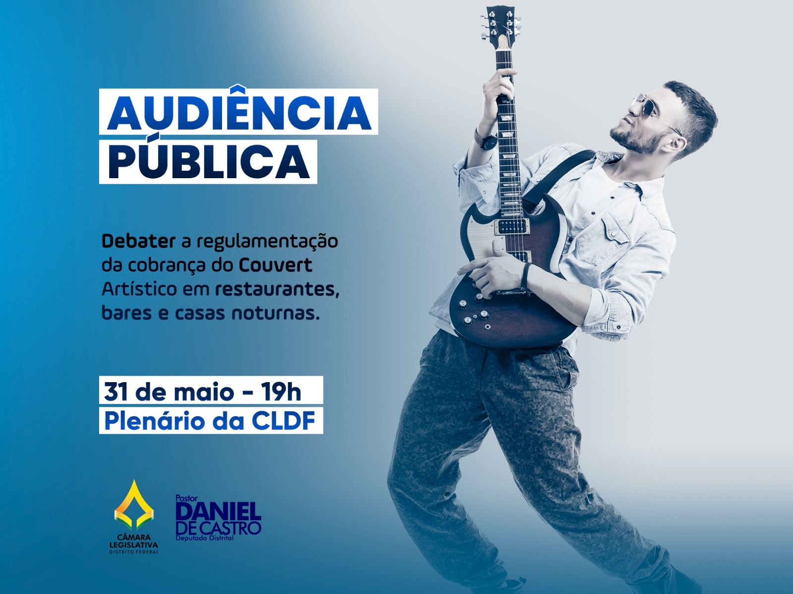 A proposta de regulamentação da oferta de serviço de tipo couvert artístico e o repasse da sua cobrança no Distrito Federal será tema da Audiência Pública na quarta-feira, 31. O debate realizado de forma presencial, é de iniciativa do Deputado Pastor Daniel de Castro (PP).